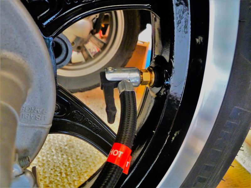 I removed the wheel from my Piaggio and took it along with my new Pirelli Angel rear tire to the dealer for the tire R&R.